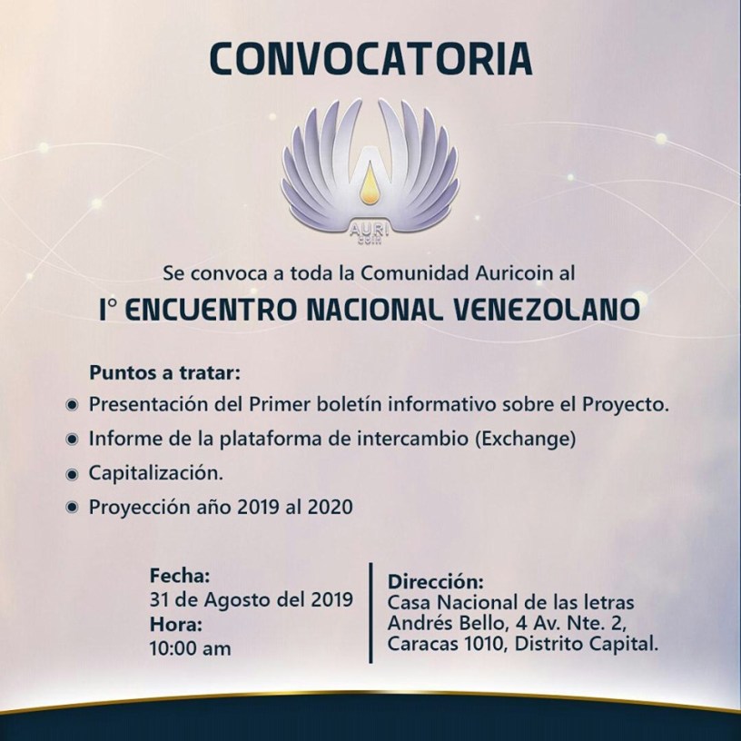 El acto de lanzamiento oficialmente, se efectuó la mañana de este sábado de Auri Coin, la alternativa en moneda virtual fue en el auditorium de la Casa Nacional de las Letras Andres Bello de Caracas.