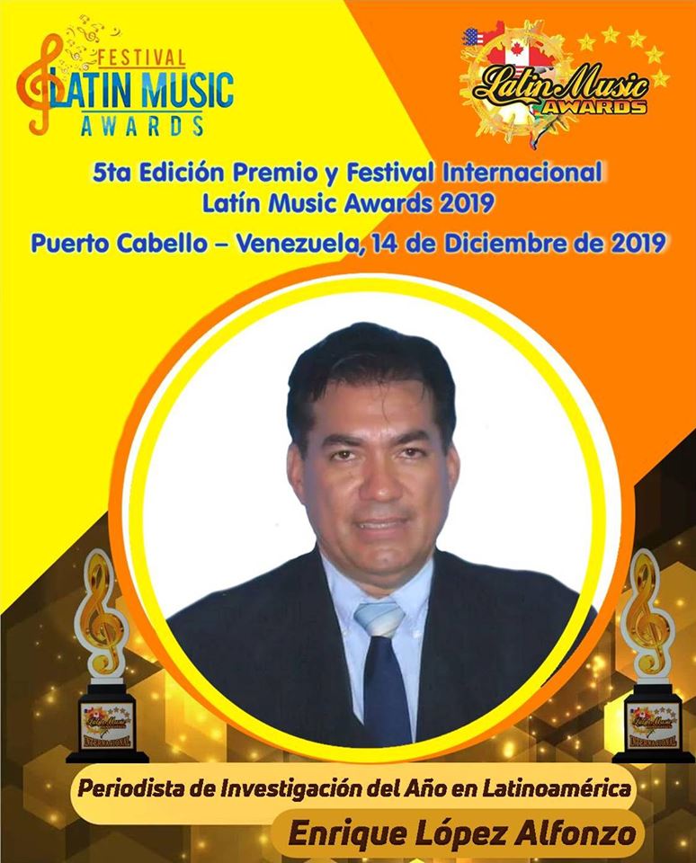 El próximo sábado 14 de diciembre, la Fundación Cultural Latinoamericano de Oro (Funculatino), galardonara al comunicador social de larga trayectoria, Enrique López Alfonzo con la entrega del premio Latin Music Awards 2019, como Periodista de Investigación del Año en Latinoamérica, en el histórico Teatro Municipal de la ciudad turística y marítima de Puerto Cabello, en el marco de la 5ta. Edición de este prestigioso galardón.