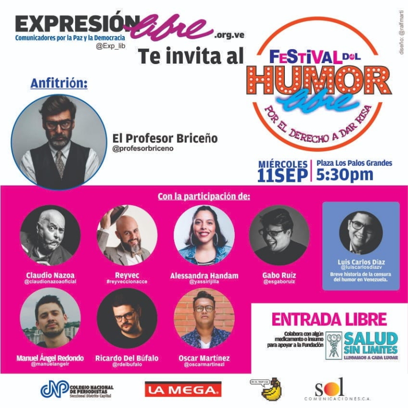Porque reír es fundamental para el espíritu y porque los humoristas tienen el derecho de ejercer su oficio en libertad, la Asociación Civil Expresión Libre, Comunicadores por la Paz y la Democracia, ha organizado el “Festival del Humor Libre, por el derecho a dar risa”, a realizarse el próximo 11 de septiembre, a partir de las 5:30 pm, en la Plaza Los Palos Grandes del municipio Chacao.