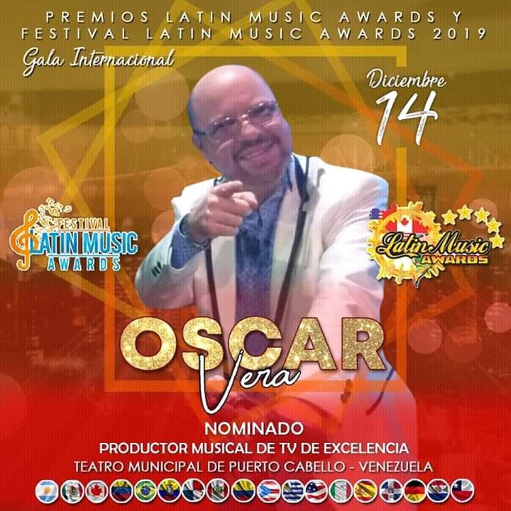 La “Fundación Cultural Latinoamericano de Oro” (Funculatino), con sede en Miami y sub-sede en Venezuela, realizará el sábado 14 de diciembre, la V Entrega de los “Premios Latin Music Awards 2019″, presidido por el licenciado Luis Arnaldo Camejo Rojas, quien se complace en anunciar que el ciudadano Oscar Vera, ha sido nominado a este galardón como Productor Musical de TV de Excelencia en Venezuela.