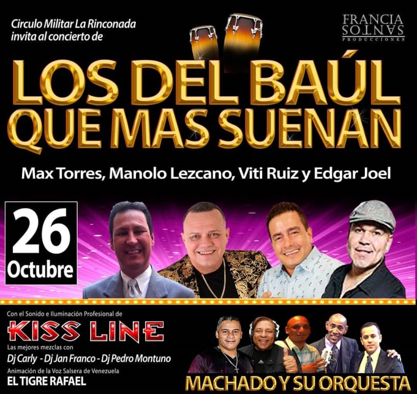 La gran cita del año 2019 que reunirá el próximo 26 de octubre a los duros de la salsa baúl; Edgar Joel, Max Torres, Manolo Lezcano, Viti Ruiz, Dj Carly, Dj Pedro Montuno, Dj Jan Franco, Alejo Morera, Machado y su Orquesta e invitados especiales en el escenario del Círculo Militar la Rinconada – Salón Catatumbo bajo la producción de FRANCIA SANTOS PRODUCCIONES.