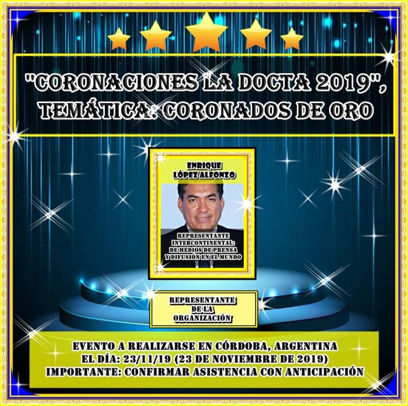 ¡Gracias, se trata de Enrique López Alfonzo, por colaborar y compartir: esta maravillosa labor de premiación, de talentos globales! Les agradecemos a todos y todas, las personas talentosas que, ya forman parte de: »Coronaciones la Docta 2019 – Coronaciones de Oro».