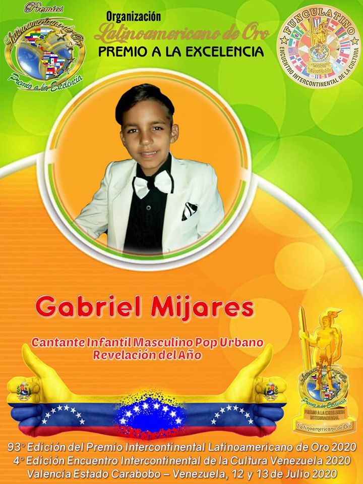 El anuncio lo hizo Luis Arnaldo Camejo Rojas presidente de la Fundación Cultural Latinoamericano de Oro (Funculatino), por unanimidad del Consejo de Honor y su directorio, ha decidido otorgar el Premio Latinoamericano de Oro 2020 a Gabriel Mijares como Cantante Infantil Masculino Pop Urbano Revelación del Año.