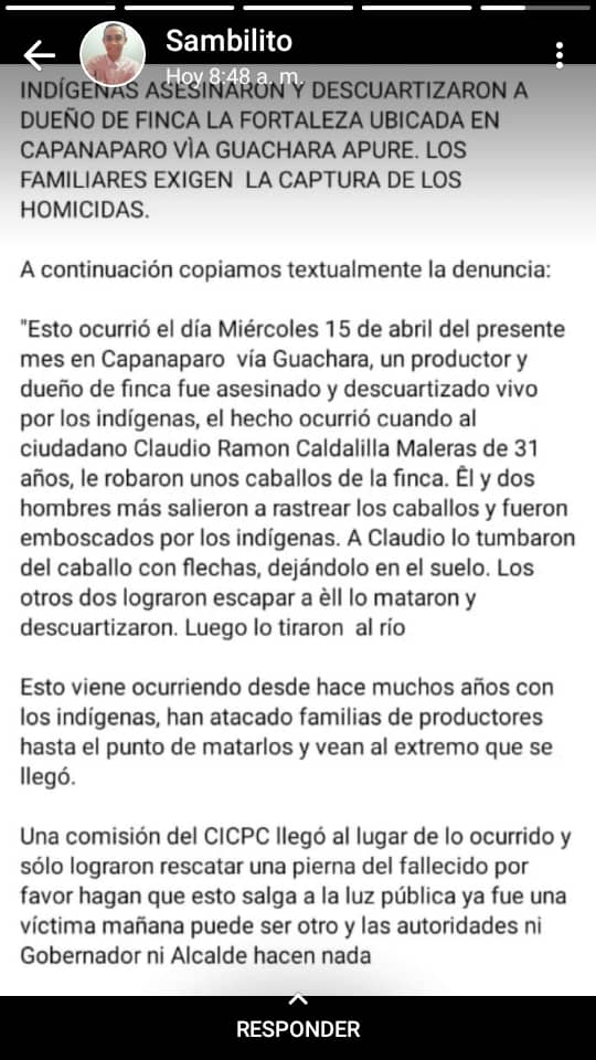 Los familiares y los ganaderos del pueblo apureño, exigen justicia y piden a los funcionarios policiales como Cicpc, Policía del estado y de la Guardia Nacional, que se avoquen a resolver el caso del vil asesinato del productor agropecuario Claudio Ramón Calzadilla Maleras, de 31 años, ocurrido en la Finca La Fortaleza sector Capanaparo en el estado Apure.