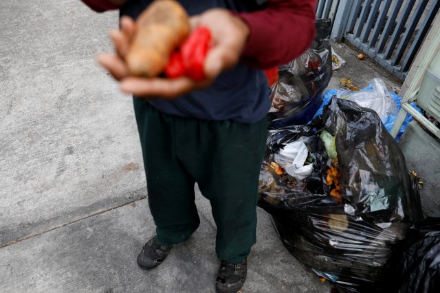 Un hombre sostiene verduras que encontró en un contenedor de basura en Caracas. REUTERS / Carlos Jasso
