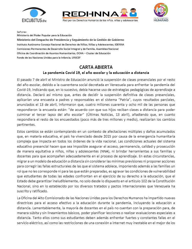 La Red de Derechos Humanos de Niños, Niñas y Adolescentes (Redhnna) junto a 71 organizaciones sociales y 149 personas entre ellos educadores, religiosos, defensores y defensoras de derechos humanos, dirigieron una Carta abierta: “La pandemia Covid 19, el año escolar y la educación a distancia” dirigida al Ministerio del Poder Popular para la Educación, Ministerio del Despacho de Presidencia y Seguimiento de la Gestión de Gobierno, Instituto Autónomo Consejo Nacional de Derechos de Niños, Niñas y Adolescentes, IDENNA, Comisiones Permanentes de Desarrollo Social Integral y de Familia, Asamblea Nacional, Oficina de Coordinación de Asuntos Humanitarios, OCHA – Cluster de Educación, Fondo de las Naciones Unidas para la Infancia y UNICEF con la finalidad de advertir la necesidad urgente de atender y proteger a los niños, niñas y adolescentes (NNA) durante el contexto actual y vigilar que sus procesos de aprendizaje se verifiquen en un entorno de bienestar.