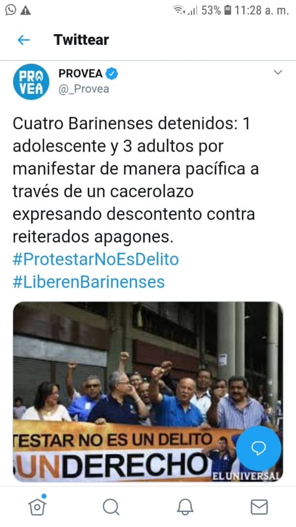 En Santa Barbara de Barinas, tambien sucedio hace dos dias un evento similar y las fuerzas policiales, acordaron privar de libertad a un educador, y a otras personas, solo por manifestar su descontento por los apagones hasta 3 por dias, falta de gas, gasolina, internet, agua y pare usted de contar…
