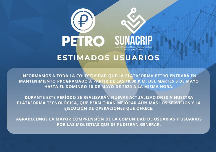 Según se conoció a través de un comunicado de prensa publicado en sus redes sociales, y citado por VTV, que la finalidad de la suspensión de las operaciones en la plataforma del Petro es “realizar actualizaciones a la plataforma y en definitiva brindar un mejor servicio a toda la comunidad“.