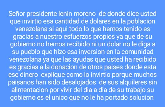 Pero también es importante solicitar un manejo transparente de los recursos que se generan en nombre de la migración venezolana…así como desmentir la posición displicente del señor Lenin Moreno que miente con descaro al decir que ha gasto 500 millones en la atención de los venezolanos y casi asevera que por nuestra llegada al ECUADOR; esto ha sido motivo para su fracaso en las políticas públicas de su Gobierno.