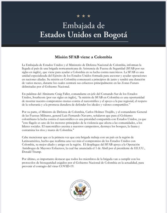 “La misión de SFAB en Colombia es una oportunidad de mostrar nuestro compromiso mutuo contra el narcotráfico y el apoyo a la paz regional, el respeto de la soberanía y a la promesa duradera de defender los ideales y valores compartidos”, dijo el comandante en jefe del Comando Sur de Estados Unidos (Southcom, por sus siglas en inglés), almirante Craig Faller, citado en la información diplomática.