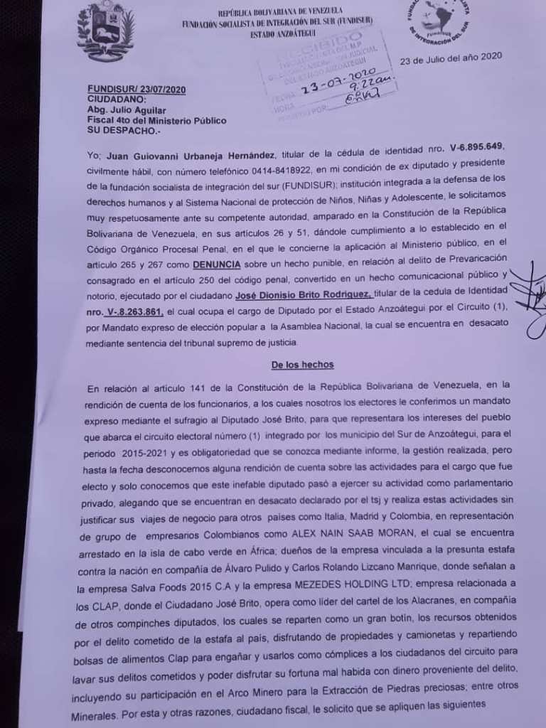 Este parlamentario nacional no representa los intereses del pueblo que lo eligió y aprovechó el desacato para extender su mafia organizada para fines personales contra los intereses de los que votamos por él, en la Zona Sur del estado Anzoátegui, así lo manifestaron el ex diputado Giovani Urbaneja presidente de Fundisur y el abogado Adrián Moreno.