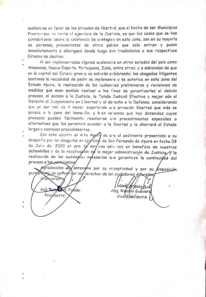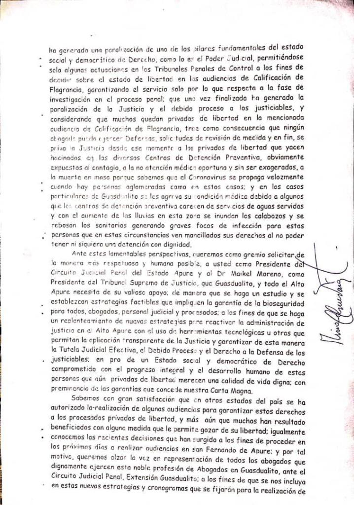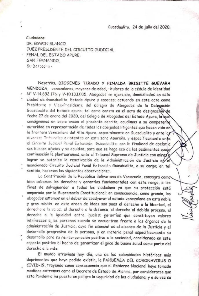 La directiva del Colegio de Abogados Delegación Guasdualito del estado Apure, a través de su presidente, abogado Diógenes Tirado y Rinalda Guevara, vicepresidente, ante la paralización de los procesos en los estrados judiciales por la pandemia de COVID-19, desde hace casi cinco meses y la reiterada extensión de la suspensión de actividades de la administración de la justicia, conjuntamente y en representación de los agremiados y abogados litigantes solicitamos muy respetuosamente y de manera formal, al ciudadano Doctor Edwin Blanco Juez Rector y Presidente del Circuito Judicial Penal del estado Apure, a fin de que sea mediador ante el Tribunal Supremo de Justicia, para exigir la pronta reactivación del Sistema Judicial en la región fronteriza y el municipio Páez.