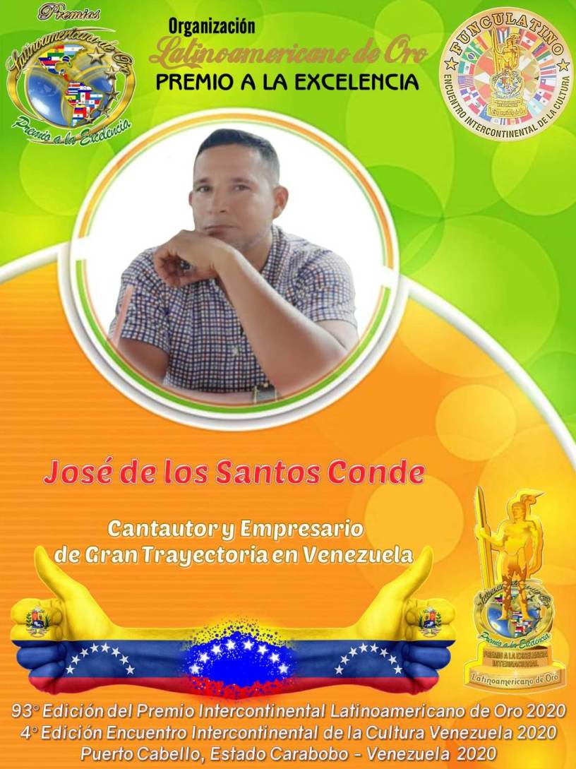 En ceremonia de gala, a llevarse a cabo en el Teatro Municipal de Puerto Cabello estado Carabobo – Venezuela, José de Los Santos Conde, recibirá en medio de la asistencia de más de 600 artistas, empresarios, gente del arte y la cultura de la región y de los hispanoamericanos, debido al mérito su actuación en el mundo del espectáculo, ha sido seleccionado como ganador de la XCIII versión del “Premio Intercontinental Latinoamericano de Oro 2020” convocado con el respaldo de la Fundación Cultural Latinoamericano de Oro (Funculatino), a través de su presidente, el licenciado Luis Arnaldo Camejo Rojas.