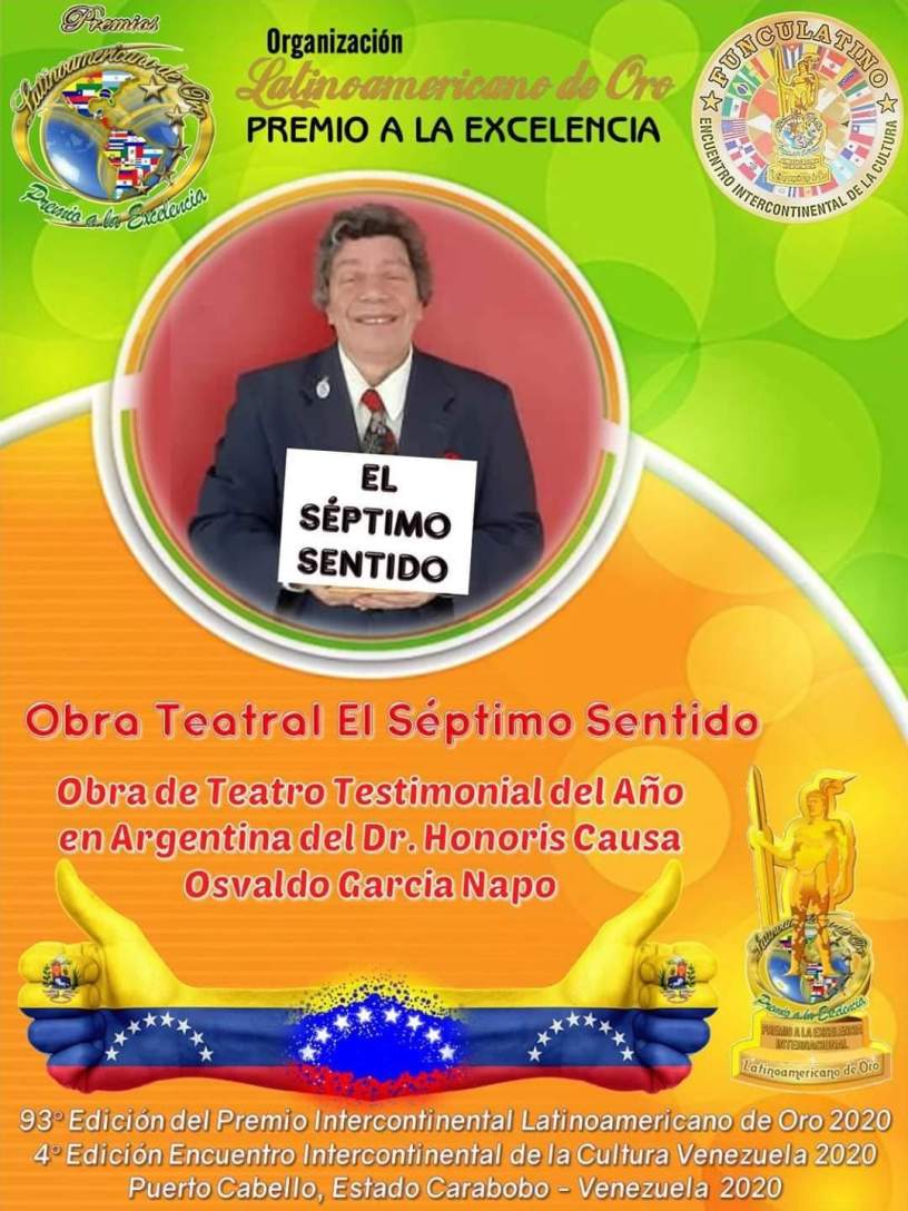 En esta ocasión, la Junta Directiva de la Fundación Cultural Latinoamericana de Oro (Funculatino), encabezada por Luis Arnaldo Camejo Rojas, se enorgullece en nominar al Premio Intercontinental Latinoamericano de Oro 2020, por la Obra Teatral El Séptimo Sentido del Dr. Honoris Causa Osvaldo Garcia Napo y un gran elenco, como Obra de Teatro Testimonial del Año en Argentina.
