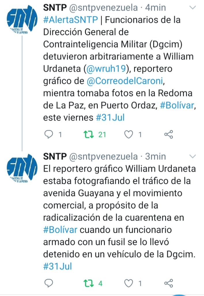 Lo liberaron después de robarle el teléfono celular y la memoria de la cámara #31Jul— SNTP (@sntpvenezuela) July 31, 2020
