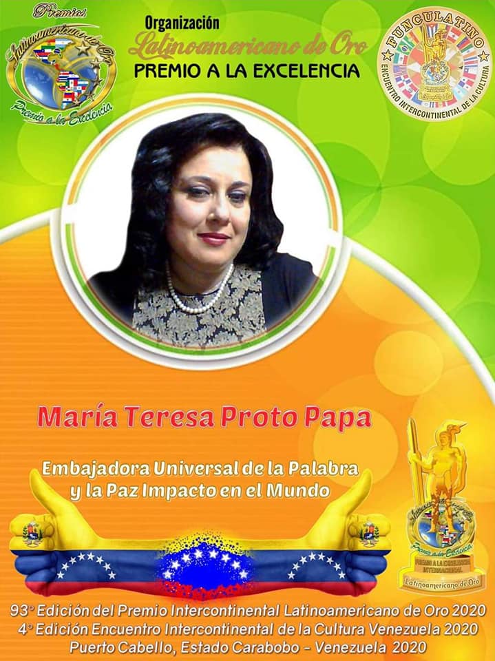 La Junta Directiva de la Funculatino, encabezada por Don Luis Arnaldo Camejo Rojas, anunció en rueda de prensa, llevada a cabo este lunes 3 de agosto, la nominación de María Teresa Proto Papa al Premio Latinoamericano de Oro 2020, como: “Embajadora Universal de la Palabra y La Paz Impacto en el Mundo”.