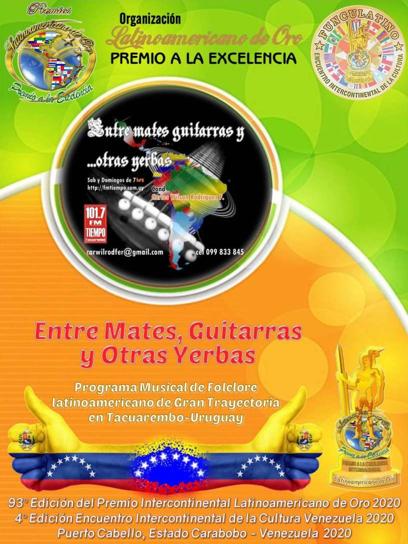 La Fundación Cultural Latinoamericano de Oro (Funculatino), a través de su presidente, el licenciado Luis Arnaldo Camejo, se complace en felicitar al equipo de «Entre Mates, Guitarras y otras Yerbas» con motivo de ser galardonados con el Premio Latinoamericano de Oro 2020.