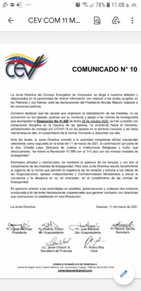 La Junta Directiva del Consejo Evangélico de Venezuela informa a los pastores, autoridades eclesiásticas, organizaciones y concilios que se ratifican la Reapertura de los Templos y que se mantiene el Esquema 7 + 7 Plus según acuerdo con el Ejecutivo Nacional.