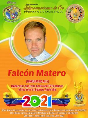 FUNCULATINO FELICITA A: “FALCÓN MATERO»..!!! CONGRATULACIONES por ser una de las Grandes «PERSONALIDADES INTERCONTINENTALES»… En el MUNDO… SELECCIONADOS Y CERTIFICADOS POR EL CONSEJO DE HONOR DE FUNCULATINO a recibir el GALARDÓN INTERCONTINENTAL «LATINOAMERICANO DE ORO 2020 | 2021» MENCIÓN “TITANIO” COMO: «MODERADOR Y PRODUCTOR LATINO DE RADIO Y TV DEL AÑO EN SYDNEY AUSTRALIA» [ALIADO FUNCULATINO]…En su Entrega XCIlI (93) en el ESTADO CARABOBO – VENEZUELA; El Premio de Mayor Prestigio en HISPANOAMÉRICA … CARABOBO se Viste de LUCES Y ESTRELLAS en este 2021 con el «4° ENCUENTRO INTERCONTINENTAL DE LA CULTURA VENEZUELA 2020 | 2021» a realizarse en el Estado Carabobo – Venezuela, el Día VIERNES 23 DE JULIO EN EL ESTADO CARABOBO, VENEZUELA A LAS 9:00 HRS HASTA LAS 17:00 HRS. SI EL GOBIERNO DE LA REPÚBLICA BOLIVARIANA DE VENEZUELA NO DECRETA LA PRÓRROGA DEL CONFINAMIENTO, MOVILIDAD Y AGRUPACIÓN DE PERSONAS EN ESPACIOS PÚBLICOS Y PRIVADOS, DEL CUAL USTED SERÁ INFORMADO(A) A TRAVÉS DE NUESTRAS REDES SOCIALES Y PÁGINA WEB; y el DÍA SÁBADO 24 DE JULIO TODOS LOS PARTICIPANTES DEL 4° ENCUENTRO INTERCONTINENTAL DE LA CULTURA VENEZUELA 2020|2021 y los GALARDONADOS de la 93° EDICIÓN DEL PREMIO INTERCONTINENTAL LATINOAMERICANO DE ORO 2020|2021, recibirán su respectiva ESTATUILLA ESPECIAL [EXTRANJEROS] Y PLACA VITRIFICADA H4 [VENEZOLANOS] ALUSIVA AL PREMIO INTERCONTINENTAL LATINOAMERICANO DE ORO 2020 | 2021 de reconocimiento en un reconocido TEATRO DE LOS ESTADOS ARAGUA O CARABOBO EN VENEZUELA A PARTIR DE LAS 16:00 HRS. A 17:30 HRS. ALFOMBRA ROJA. | 17:30 HRS. A 17:45 HRS. INGRESO A SALA | 17:45 HRS. A 18:00 HRS. OPENING Y APERTURA DEL ESPECTÁCULO ARTÍSTICO MUSICAL donde serán reconocidos varios Artistas Nacionales e Internacionales en un mismo Escenario, Bailarines, Cantantes, Orquestas, Actores, Actrices, Grupos musicales, Deportistas, Cultores, Poetas, Escritores, Chef, Artesanos, Empresas y Empresarios; 22:30 HRS CLAUSURA DEL ESPECTÁCULO…»SOMOS LA DIFERENCIA, QUE MARCA LA DIFERENCIA EN PREMIOS EN HISPANOAMÉRICA»…SOMOS ÚNICOS . PRODUCIMOS LO QUE SOMOS, SOMOS LO QUE PRODUCIMOS … OPTIMIZANDO LA EXPERIENCIA; PUBLICIDAD PROMOCIÓN, DIFUSIÓN, PREMIOS Y GALA DE EXCELENCIA …E-Mail latinoamericanodeorovenezuela@gmail.com / CONTACTO con el Organizador Oficial TLF + WHATSAPP +58 [414] 570.00.24 …GRATITUD Y PLENITUD…!!! LUIS ARNALDO CAMEJO ROJAS LCDO. LUIS ARNALDO CAMEJO ROJAS PRESIDENTE Y ORGANIZADOR OFICIAL INTERNACIONAL PREMIO INTERCONTINENTAL LATINOAMERICANO DE ORO 2020 | 2021 4° ENCUENTRO INTERCONTINENTAL DE LA CULTURA VENEZUELA 2020 | 2021 +58 [414] 570.00.24 | +58 [426] 472.06.42