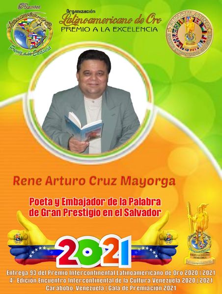En definitiva, son premios a su esfuerzo y dedicación en la cual han trabajado con solidaridad e incondicionalmente sin pedir nada a cambio, por todo, esto y mucho mas, es que la Fundación Cultural Latinoamericano de Oro (Funculatino), y su vocero oficial, el licenciado Luis Arnaldo Camejo Rojas, en su condición de presidente, han decidido en reunión plena y por unanimidad de sus miembros, hacer llegar las felicitaciones al ciudadano, René Arturo Cruz-Mayorga por haber sido nominado al Premio Intercontinental Latinoamericano de Oro 2020-21, a realizarse en la ciudad de Valencia estado Carabobo-Venezuela, durante los días 23 y 24 de julio de este año.