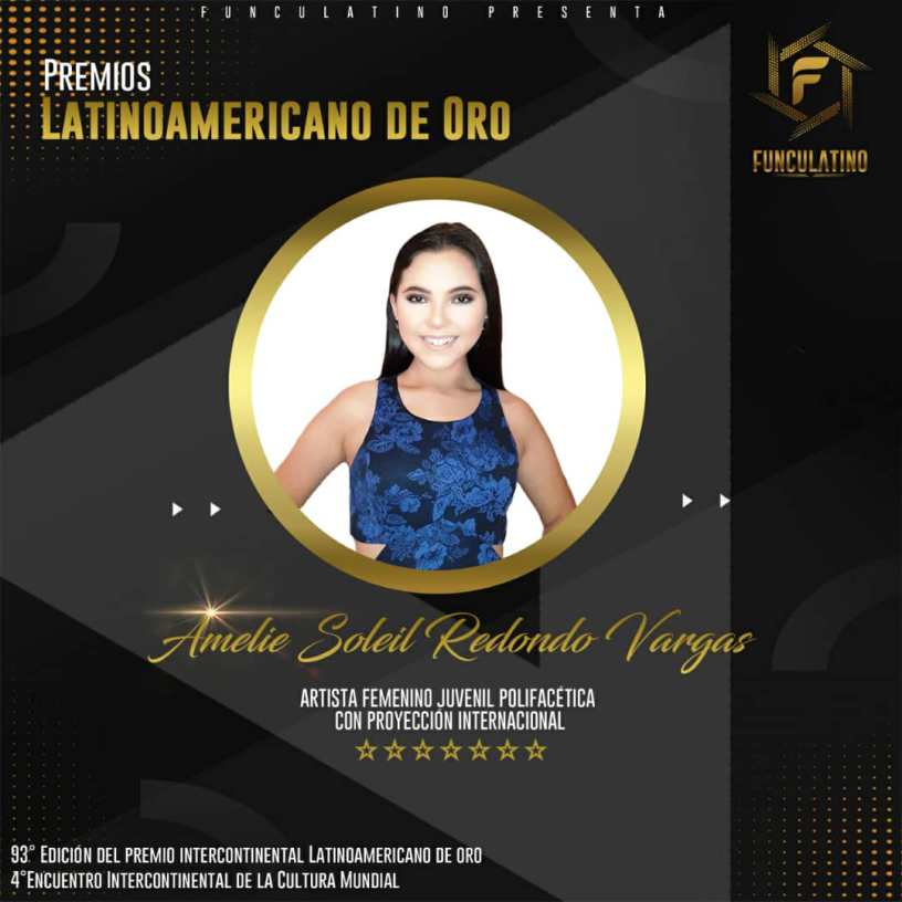Ella se ha destacado en los estudios en estos meses de confinamiento, demostrado como las nuevas generaciones hacen gala de la tecnología para continuar con éxitos en la secundaria; también canta y baila es toda una artista, que combina con el modelaje, la actuación y la animación; por esos atributos el consejo de honor de Funculatino, este año la galardonará otra vez, pero en esta ocasión como: Artista Femenino Juvenil Polifacética con Proyección Internacional.