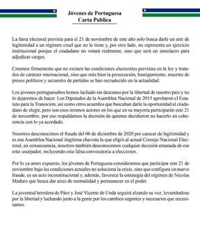 Carta pública: Más de 50 líderes juveniles de Portuguesa nos pronunciamos contra el fraude del 21N. No nos rendimos, no doblegamos ni nos vendemos ante un régimen criminal, nosotros lucharemos hasta vencer.