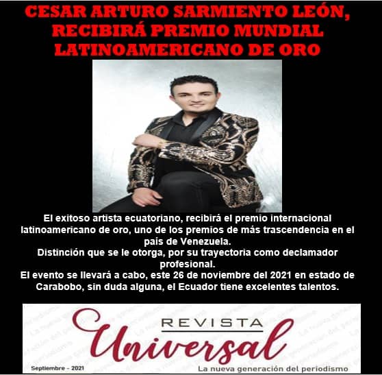 Camejo dijo que se complace en nominar a la CESAR ARTURO SARMIENTO LEÓN como: “DECLAMADOR DEL AÑO EN LATINO-AMÉRICA DE GRAN PRESTIGIO Y EXCELENCIA DEL ECUADOR”, para los Premios Intercontinental Latinoamericano de Oro 2020-21.