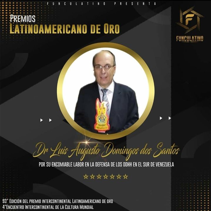 La Fundación Cultural Latinoamericano de Oro (Funculatino), hizo entrega al Doctor Luis Augusto Domingos Dos Santos el «Premio Intercontinental Latinoamericano de Oro como Defensor de Los Derechos Humanos », así lo dijo el presidente de Funculatino, licenciado Luis Arnaldo Camejo.
