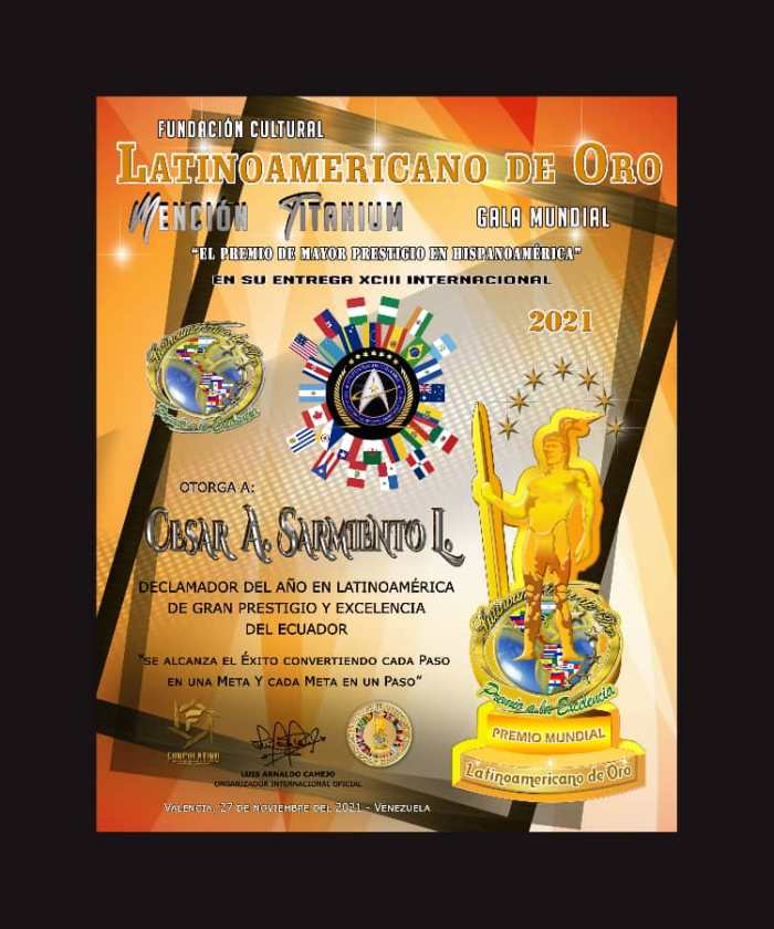El suramericano Cesar Arturo Sarmiento León, fue galardonado este sábado 27 de noviembre en el Auditorio de la Villa Deportiva de Valencia estado carabobo, por la junta directiva de la Fundación Cultural Latinoamericano de Oro, presidida por el licenciado Luis Arnaldo Camejo Rojas, en un apoteosico evento con el objeto de estimular, a quienes sienten el arte como una prolongación de la vida y el yo creativo; en medio de la pandemia, y en el marco de la XCIII Edición del Premio Intercontinental Latinoamericano de Oro.