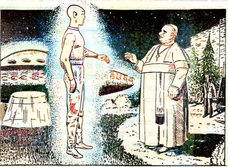 Moments later, they raised their heads, but the alien was still only a few meters away from them. Without saying a word, Pope John XXIII got up and walked towards the alien. Loris dropped to his knees, watching the Pope and the alien speak.