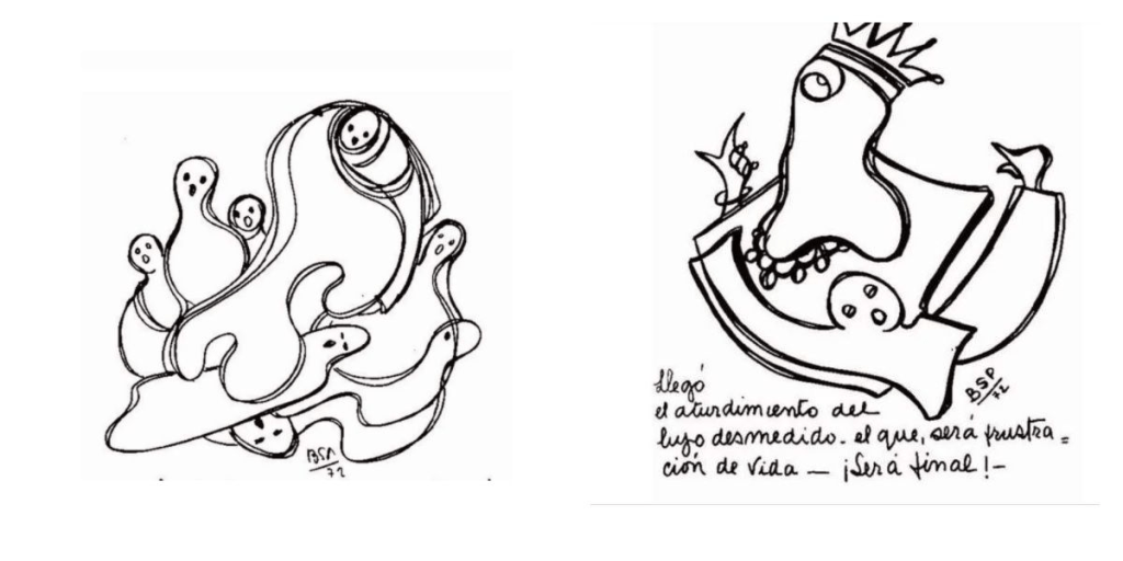 En uno de los dibujos que se viralizó en estos días se puede ver a un hombre con una forma extraña, sosteniendo un objeto en su mano, mientras una lámpara lo ilumina. “Fuego, hambre, pestes, muerte, repite la campaña justiciera que se acerca al mundo, más aún el mundo no escucha, ni ve, Viene la Tiniebla del dragón que pareció dormido. Viene el terror del oso que fingió amor y hermandad. Viene el demócrata humilde, que no lo fue nunca y viene con él la pobreza, él sin albergue, y con ellos Todas las explosiones de la disgregación. Viene la oscuridad y luego, la luz del Sud. ¡Y la Cruz!”, escribió debajo.