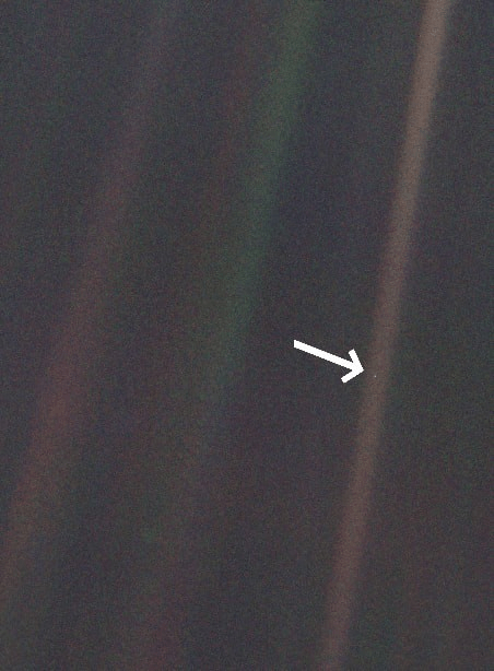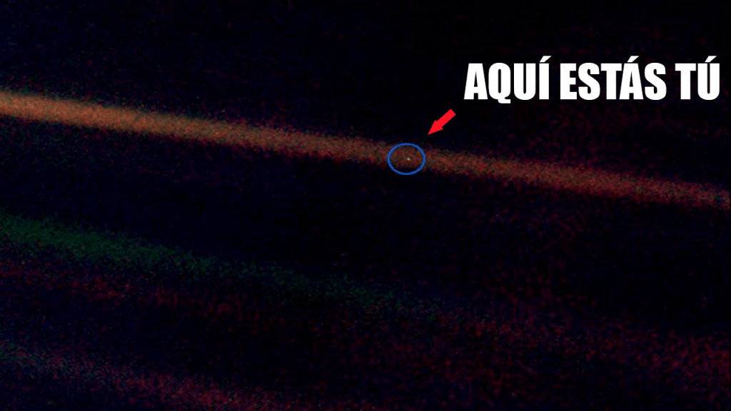 «Un punto azul pálido», capturada por la sonda espacial Voyager 1 desde una distancia de ¡seis mil millones de kilómetros! Se puede observar a un pequeño punto de luz en la inmensidad del cosmos, nuestra casa, nuestro planeta Tierra.