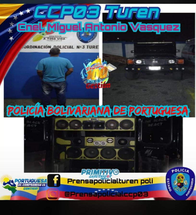 Mediante un operativo puesto en marcha en el muncipio Turén por la Policía Uniformada del estado Portuguesa en horas de la noche de ayer, fue privado de libertad un ciudadano y retenido su vehículo un Jeep, modelo Nissan Patrol de color negro por el presunto delito de contaminación sónica.