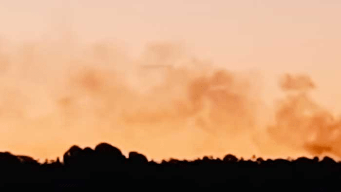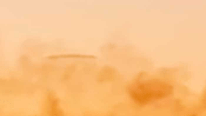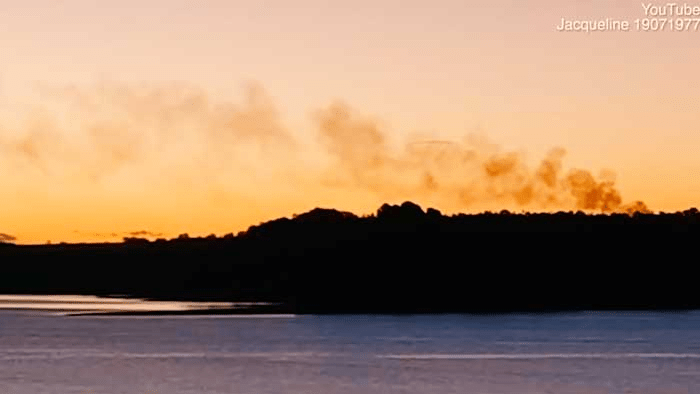 En el vídeo se puede observar una amplia figura de color oscuro con forma curvada que se encuentra flotando en medio de un humo de un fuego justo en el atardecer.