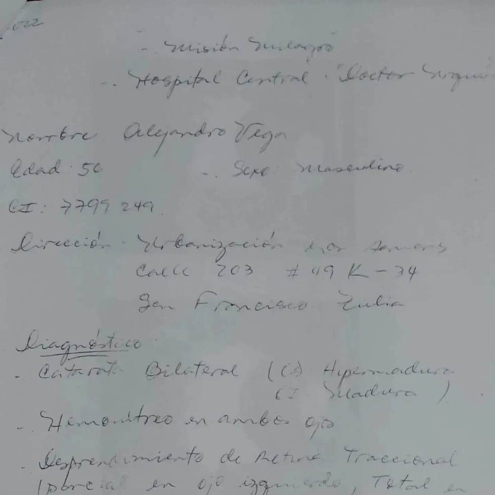En el pasado Vega y sus familiares pudieron canalizar una operación en el Hospital Central de Maracaibo, que no pudo hacerse pues el diagnóstico empeoró y requiere otro tipo de cirugía.