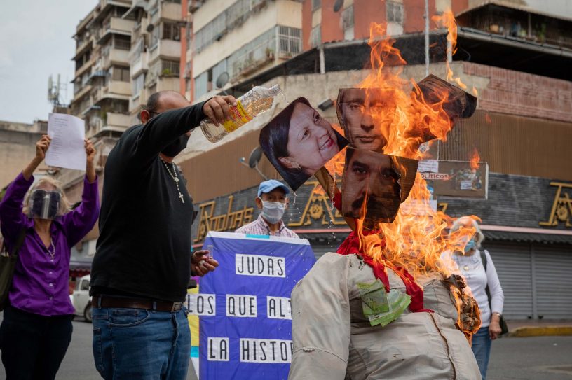 Vecinos de Caracas quemaron este domingo, para recrear la muerte de Judas, un monigote de cuatro cabezas con los rostros del presidente de Rusia, Vladímir Putin, y el mandatario, Nicolás Maduro, así como otras figuras representativas de la política del país caribeño.