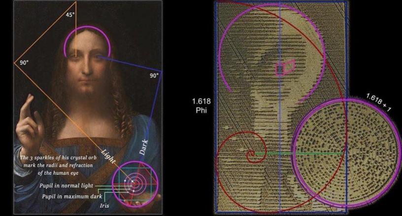 La pintura de Leonardo da Vinci, tiene una esfera de cristal transparente con tres puntos blancos. Sus distancias desde el centro definen el tamaño de la pupila del ojo. Una línea desde el centro de la esfera a través del tamaño normal de la pupila sale por la esquina de un cuadrado y se refleja en el marco dos veces y se conecta con el punto blanco en su ojo en el lado claro de la pintura.