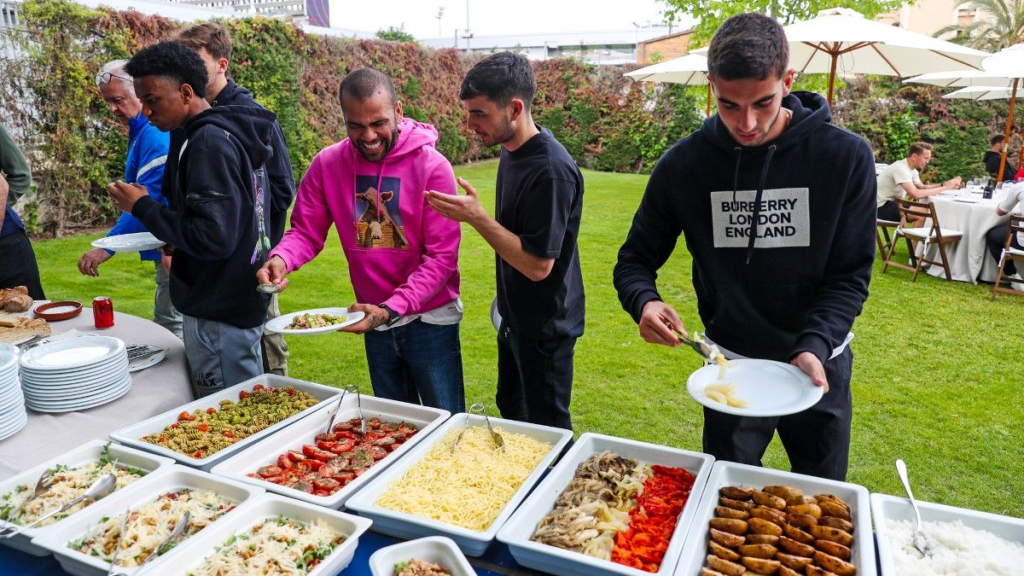 Dani Alves fue de los más alegres y bromistas, como es habitual, y llamativa fue su sudarera rosa. La plantilla se dividió en mesas y Gerard Piqué se sentó con compañeros como Sergi Roberto, Alves, Ferran Torres…