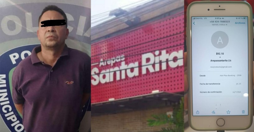 Tras varios días de seguimiento fue apresado en Arepas Santa Rita Heder José Maggiolo González (48), luego de solicitar su servicio de comida y mostrar «la transferencia de pago desde su celular«, la cual era falsa porque nunca se constató el ingreso de dinero a la cuenta del cliente.