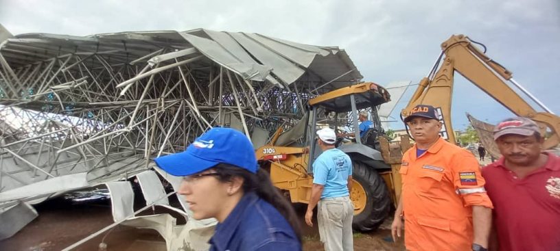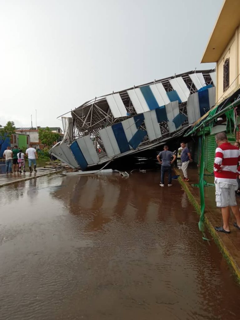 Detalló que «las ráfagas de viento levantaron buena parte del techo del mercado municipal, el cual cayó sobre unos locales a más de 40 metros de distancia. En este momento, efectivos de Protección civil, cuadrillas de la Secretaria de Ambiente de la Gobernación del Zulia, asi cómo otros organismos del gobierno nacional y municipal realizan el levantamiento y recolección de estos escombros ferrosos».