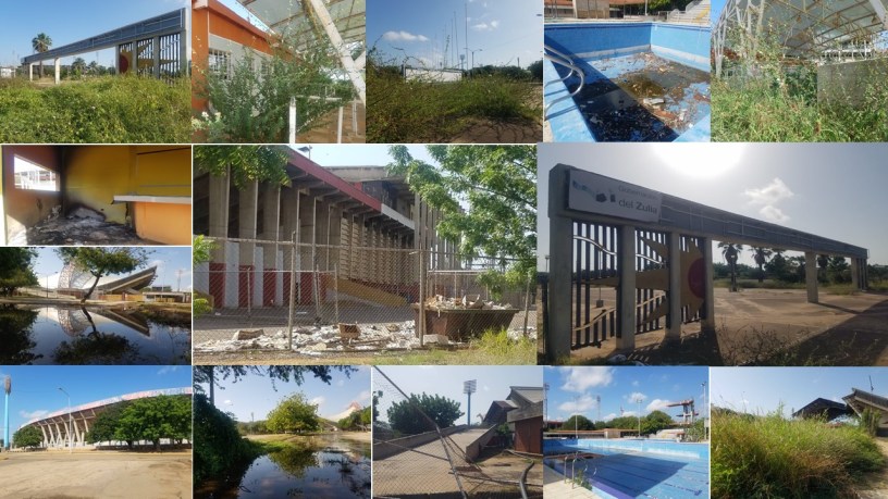 Accesos, plazas, estacionamientos y áreas externas: Cuenta con suficiente espacio como para ofrecer grandes atractivos y convertirse en lugar de esparcimiento, recreación, deporte y hasta comercio en la ciudad, pero las imágenes hablan por sí solas. Lo deplorable de sus condiciones dan ganas de llorar. Las áreas de estacionamiento están bajo la maleza y la basura. Las plazas y máquinas de ejercicio yacen allí en ruinas. El área de taquilla del estadio de béisbol se la traga el monte y la dejadez y hasta la plaza de Luis Aparicio Ortega exhibe un monte que denota abandono.