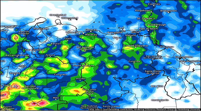 «Se observan núcleos convectivos asociados a posibles lluvias o chubascos, algunos acompañados de actividad eléctrica (destellos azules) en áreas del Zulia, Centro Occidente, Llanos Centrales, Occidentales, este de Sucre y Delta Amacuro, Amazonas y Bolívar».