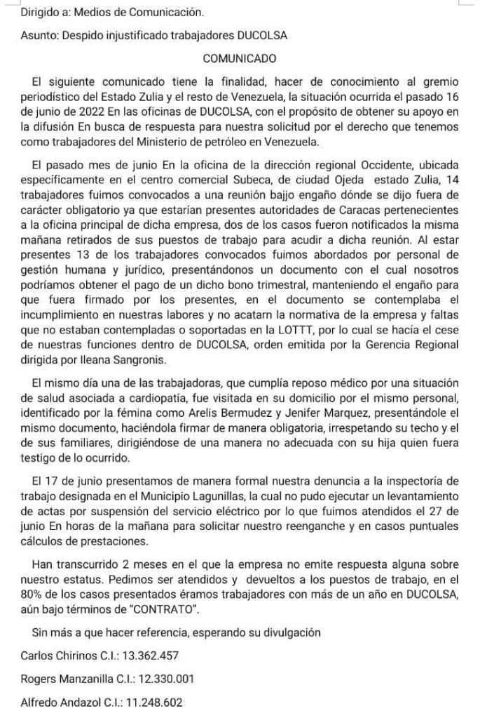 A través de un comunicado, trabajadores del ministerio del petróleo manifiestan la situación ocurrida el pasado 16 de junio en las oficinas de la dirección regional occidente, ubicada específicamente en el centro comercial Subeca, de ciudad Ojeda estado Zulia, dónde 14 trabajadores fueron convocados a una reunión de carácter obligatorio con presuntamente autoridades de Caracas pertenecientes a la oficina principal de dicha empresa.