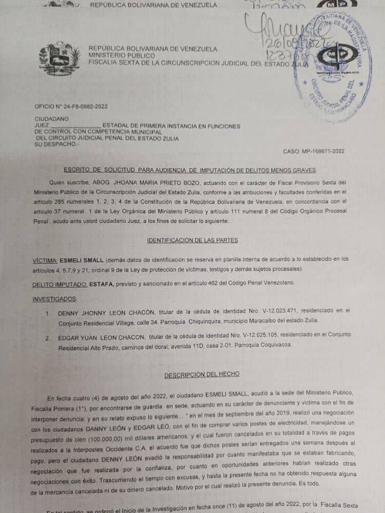Por presunta estafa fueron denunciados los empresarios Venezolanos Denny Jhonny Leon Chacon, cédula de identidad 12023471 y Edgar Yuan Leon Chacon ,cédula de identidad 12025105, ante la Fiscalía Sexta de la circunscripción judicial del estado Zulia en Venezuela , el pasado 04 de Agosto 2022 fue introducida una denuncia junto con un grupo de pruebas y le fue asignado el Número de caso o expediente: 24-F6-0982-2022.