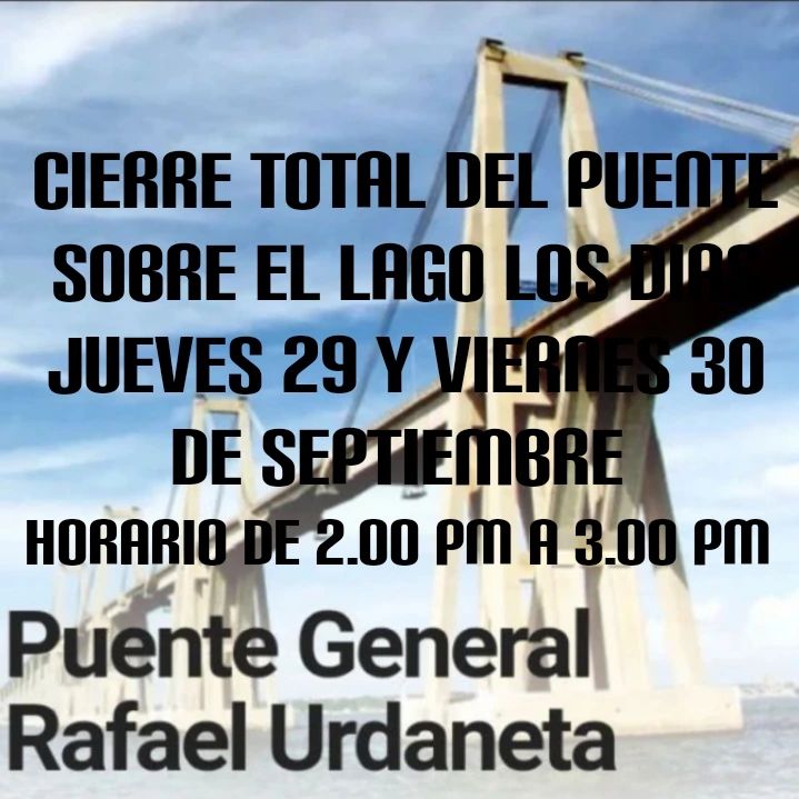 La coordinación regional de FONTUR anuncia el cierre total de la circulación vehicular por el lapso de una hora en el «coloso» puente General Rafael Urdaneta por razones de mantenimiento los días jueves 29 y viernes 30 de Septiembre desde las 2.00 pm hasta las 3.00 pm