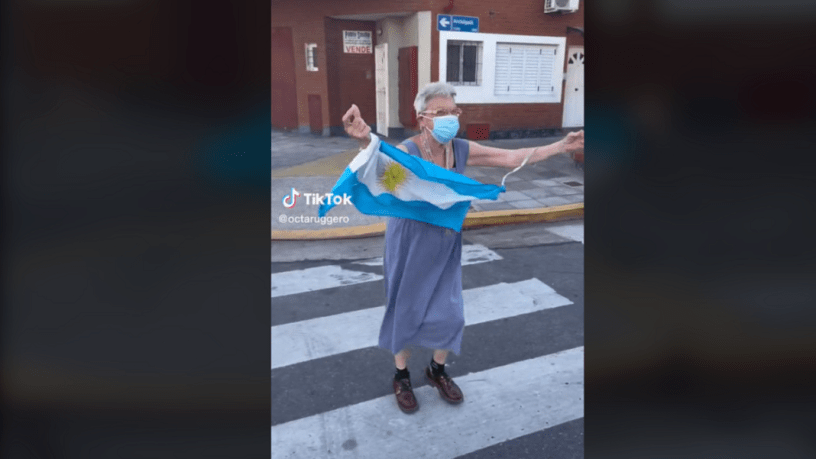En el video de la abuela festejando junto a un grupo de jóvenes la victoria 2-0 sobre Polonia por la fase de grupos del Mundial se observa a los “pibes de la esquina” abrazándola y cantándole la “abuela la, la, la” mientras la señora ondea una bandera argentina.