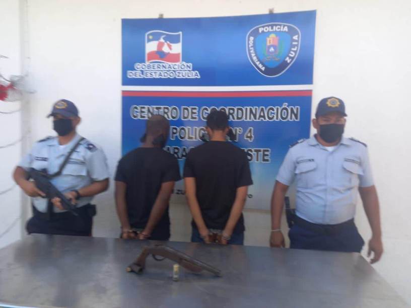 Patrulleros del Centro de Coordinación Policial Maracaibo Oeste, procesaron el arresto de Jesús Enrique Bracho Peley de 25 años y Brayan Andrés Alomia Castro de 27 años de edad, denunciados por un ciudadano, quien los señaló de amenazarlo de muerte a él y a su hijo de 15 años, con una escopeta.