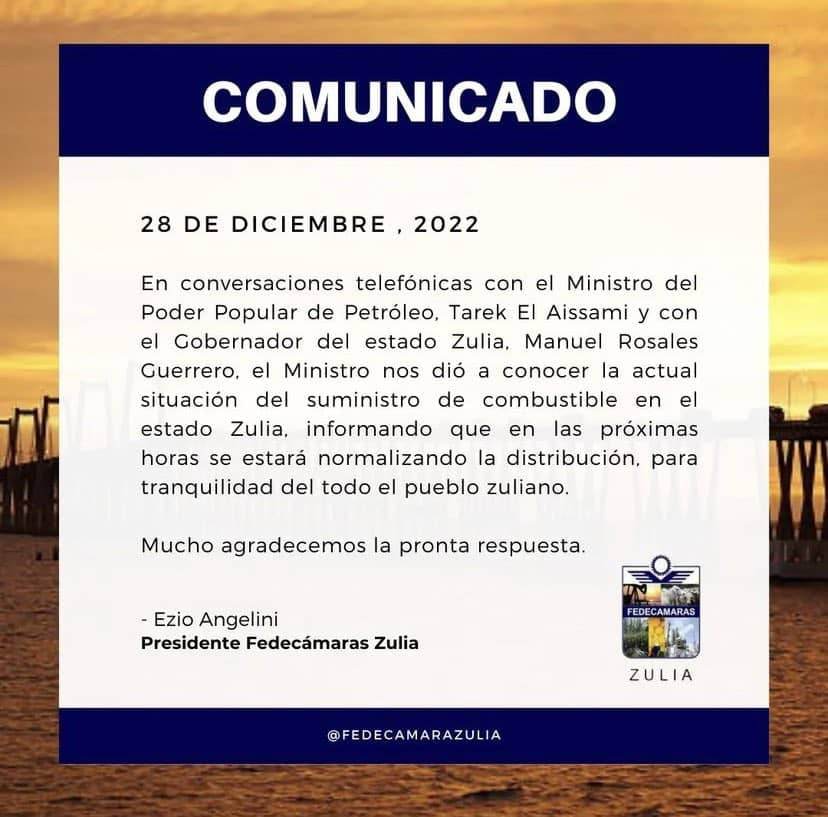 A través de un comunicado emitido por Fedecámaras Zulia, se dio a conocer que el gremio mantuvo conversaciones telefónicas con el ministro de Petróleo, Tareck El Aissami y el gobernador Manuel Rosales, donde ambos aseguraron que “en las próximas horas se estaría normalizando la distribución de combustible”.