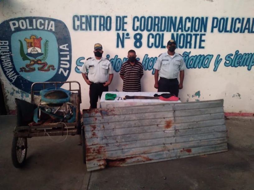 Una comisión del Centro de Coordinación Policial Col-Norte, aprehendió en flagrancia a Luis Antonio Medina Morales de 58 años de edad, quien ingresó a una vivienda del barrio Federación, parroquia Germán Ríos Linares, municipio Cabimas, donde sustrajo unas láminas de zinc, según lo informó el C/J Sergio Villasmil Rondón director general del Cuerpo de Policía del estado Zulia (Cpez).