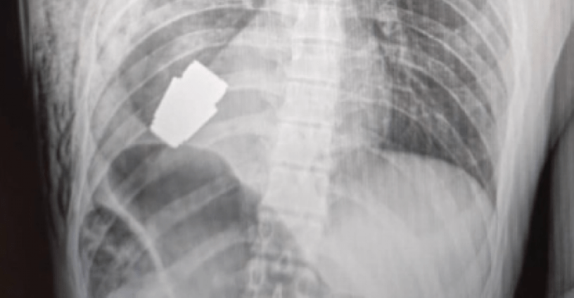 En esa mismo mensaje, el asesor ministerial publica dos fotografías: una de una radiografía que muestra la granada incrustada en el lado derecho del pecho del soldado y otra del cirujano, ya con el artefacto en la mano.
